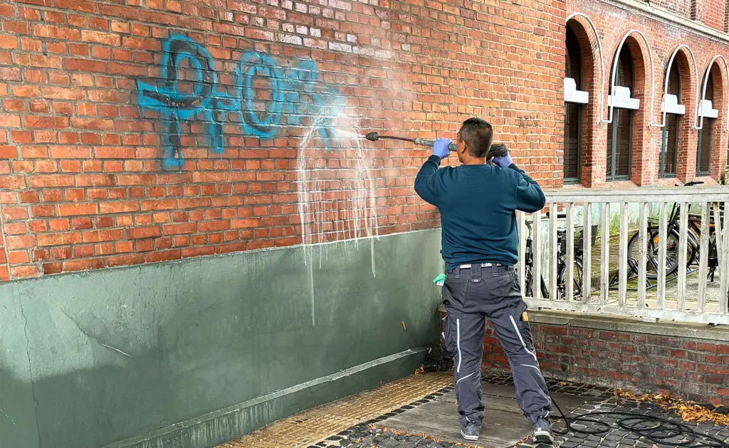 Die professionelle Entfernung von Graffiti führen wir mit einem Trockeneisgerät durch. Trockeneispellets werden mit hoher Geschwindigkeit auf die verschmutzte Oberfläche gestrahlt. Durch einen starken Temperaturunterschied verspröden die Farbschichten und werden so von dem Untergrund abgelöst. Das Entfernen mit Trockeneis ist materialschonend für die Oberflächen.